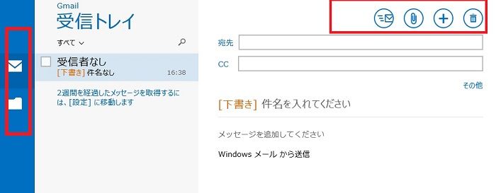 赤枠で囲んだアイコンと、矢印のアイコンあたりで、通常のWindows Liveメールのような
