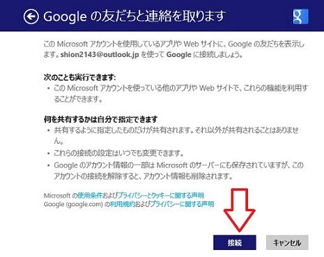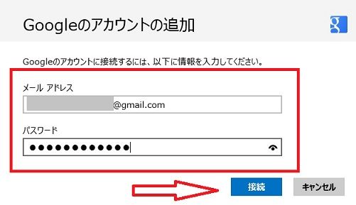 当然ですが、Gmailのアカウントです、できたら、「接続」をクリック。矢印