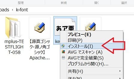 「keifont.ttf」を選択して、右クリックして、「インストール」をクリックです。赤矢印