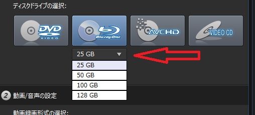 すると、BDのディスク容量を選択できるので、作成サイズに合わせます